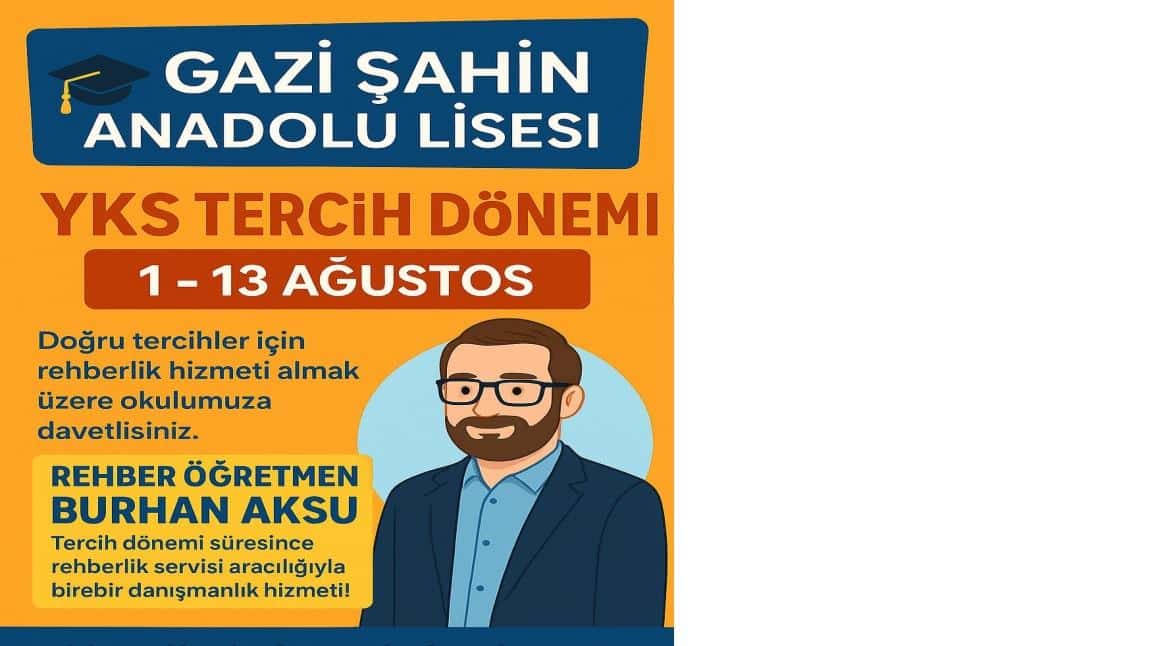 YKS 2025 Tercih Dönemi Duyurusu Gazi Şahin Anadolu Lisesi olarak, 1 - 13 Ağustos tarihleri arasında gerçekleştirilecek YKS tercih sürecinde tüm öğrencilerimize destek vermeye hazırız.